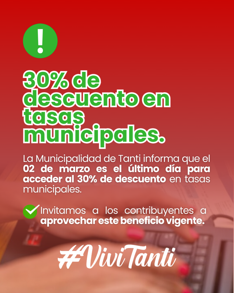 La Municipalidad de Tanti informa que el 02 de marzo es el último día para acceder al 30% de descuento en tasas municipales.