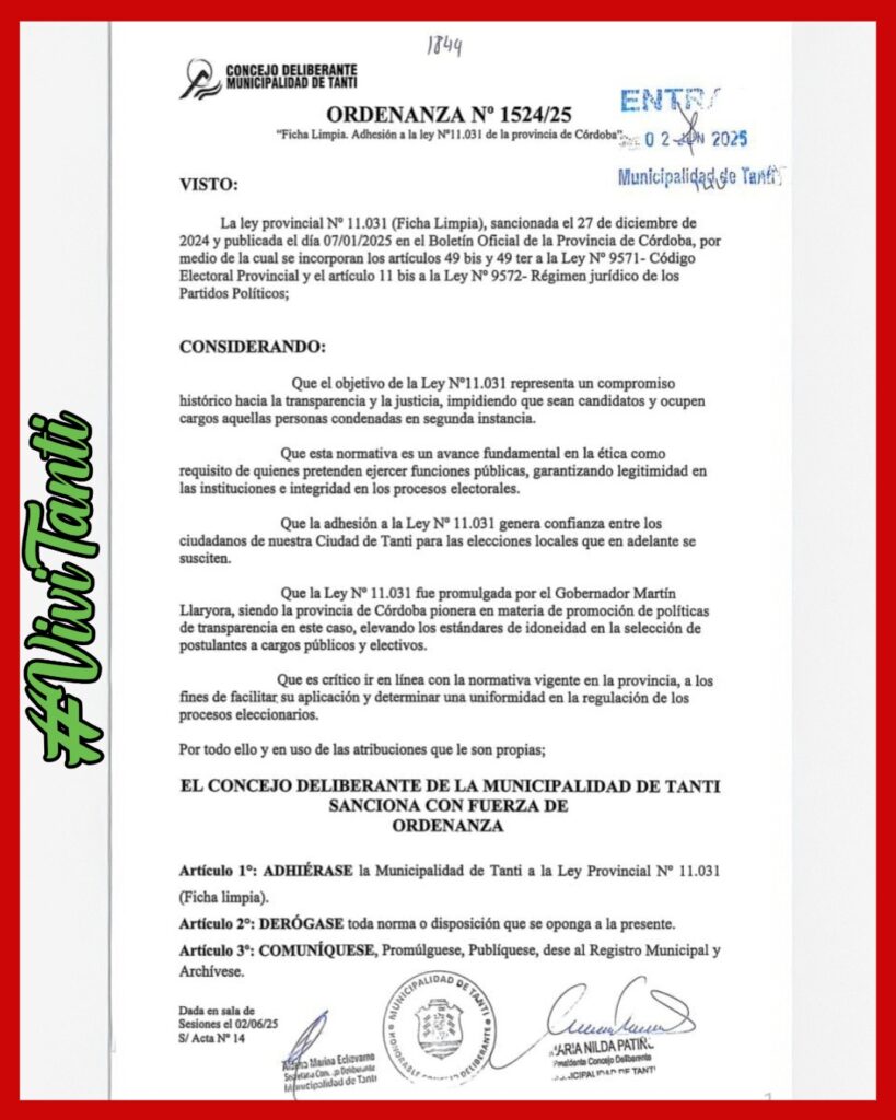 Municipalidad de Tanti – Ordenanza N° 1524/25: Adhesión a la Ley de Ficha Limpia