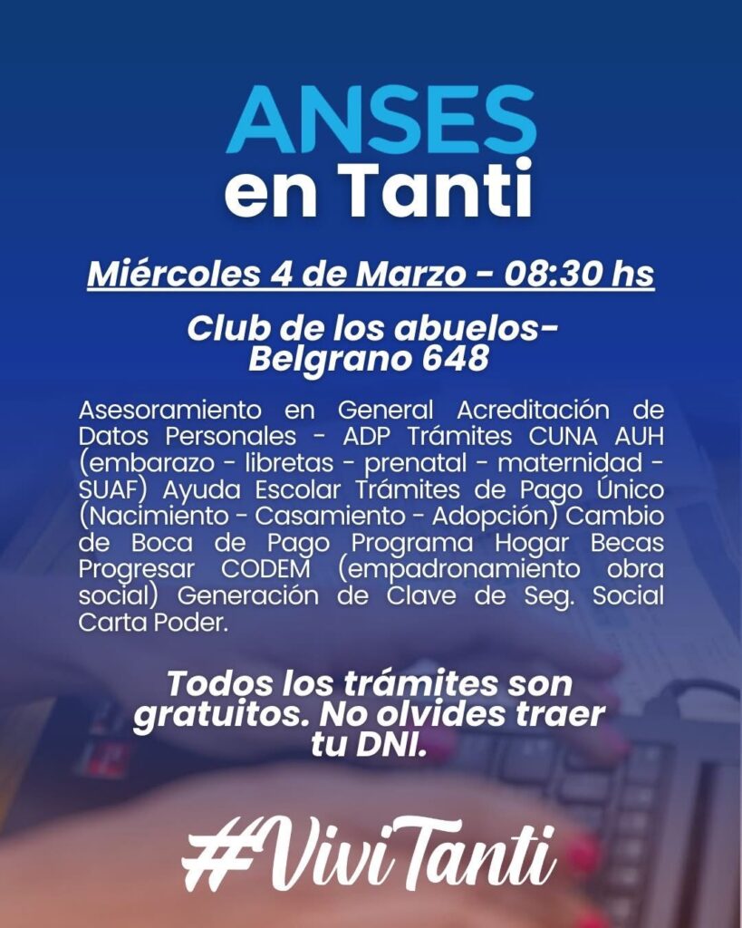 Este miércoles 4 de marzo a las 08:30 hs, personal de ANSES estará atendiendo en el Club de los Abuelos (Belgrano 648).