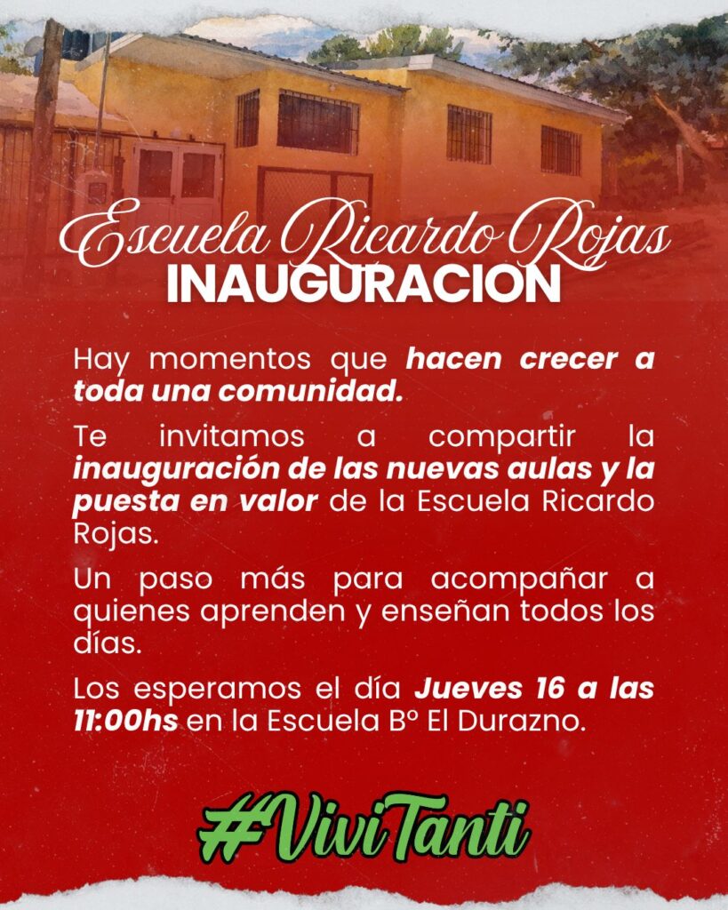El intendente Emiliano Paredes invita a vecinos y vecinas a compartir la inauguración de las nuevas aulas de la Escuela Ricardo Rojas, junto a su puesta en valor, *una obra que fortalece la educación y acompaña el crecimiento de nuestra comunidad.*