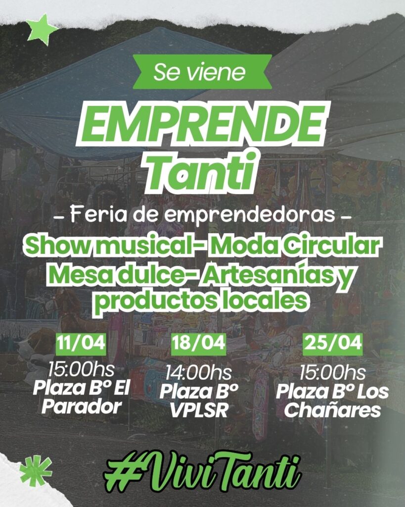 Con mucha alegría invitamos a vecinos, vecinas y visitantes a ser parte de Emprende Tanti, una feria que nace para impulsar el trabajo local, fortalecer la economía familiar y generar espacios de encuentro en nuestra comunidad 💚