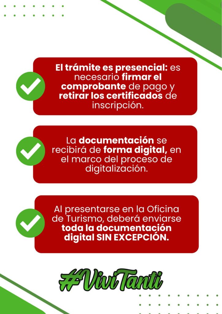 Al presentarse en la Oficina de Turismo, deberá enviarse toda la documentación digital, incluyendo sin excepción cinco (5) fotos en buena calidad y formato horizontal.